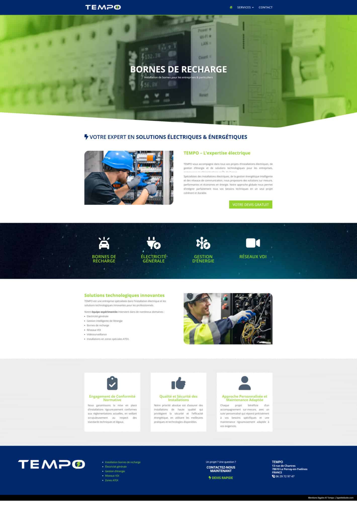 Créer un site vitrine professionnel pour présenter les services de Tempo 78, entreprise spécialisée en électricité générale et en installation de bornes de recharge pour véhicules électriques. Le site devait renforcer la crédibilité de l’entreprise, valoriser ses réalisations et faciliter la prise de contact.