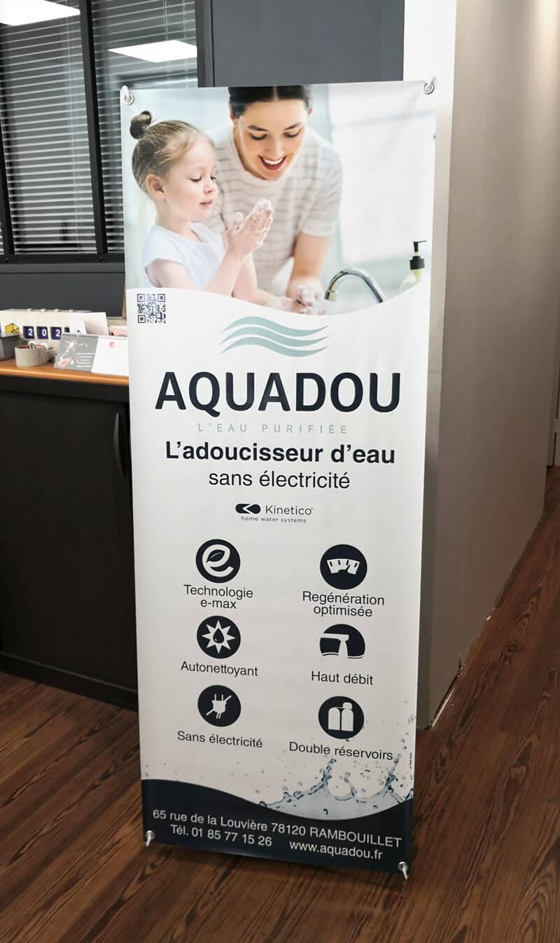 Réaliser un roll-up au design épuré, mettant en lumière les atouts clés d’une gamme unique d’adoucisseurs proposée par l’entreprise. L’objectif était de transmettre un message clair et valorisant, centré sur les bénéfices clients (simplicité d’utilisation, efficacité, durabilité), sans surcharger visuellement le support. Pensé pour une utilisation lors de salons ou en point de vente, le visuel devait incarner la fiabilité et la modernité de l’offre, tout en permettant une lecture rapide.